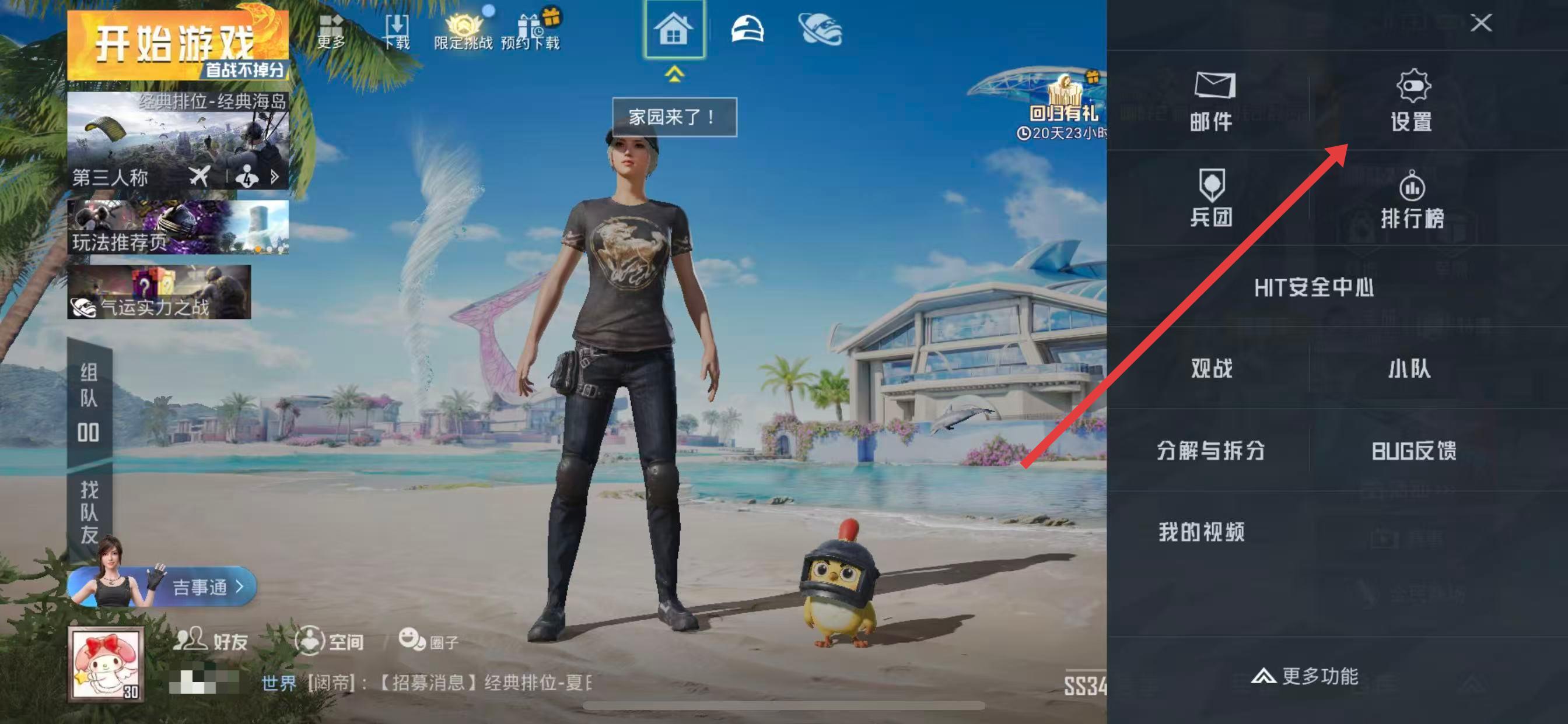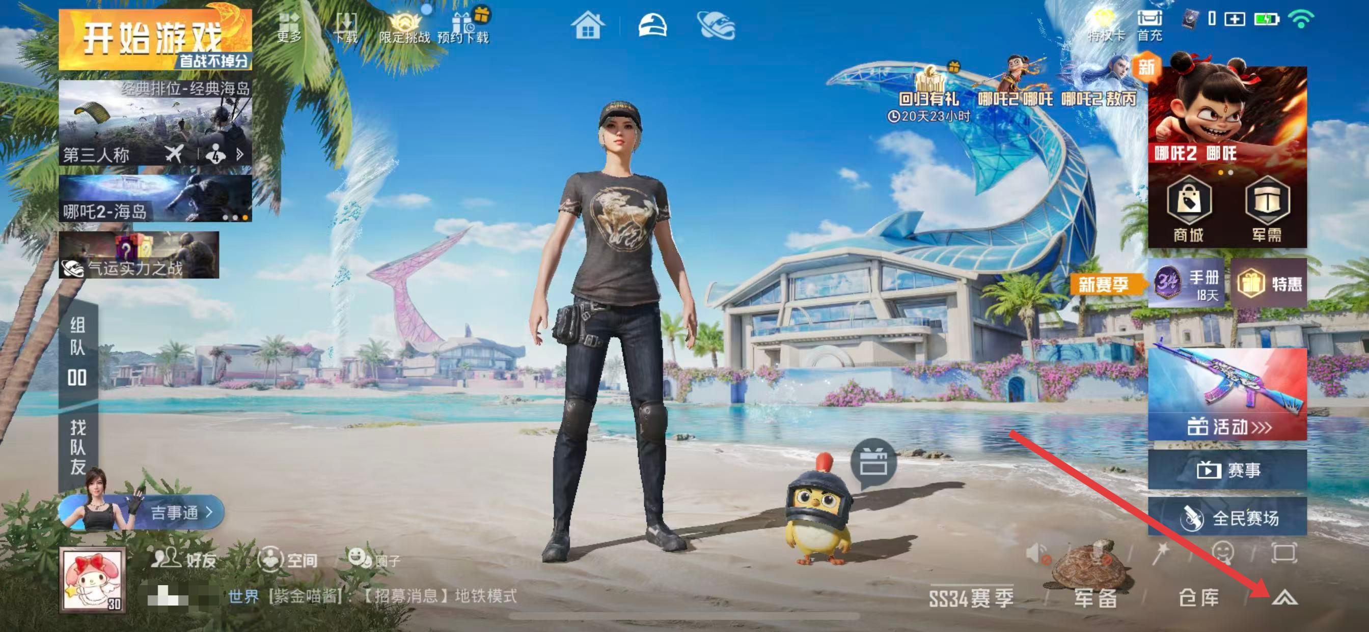 1、在和平精英游戏主界面,点击右下角由两个三角形组成的更多按钮,展开更多功能选项。