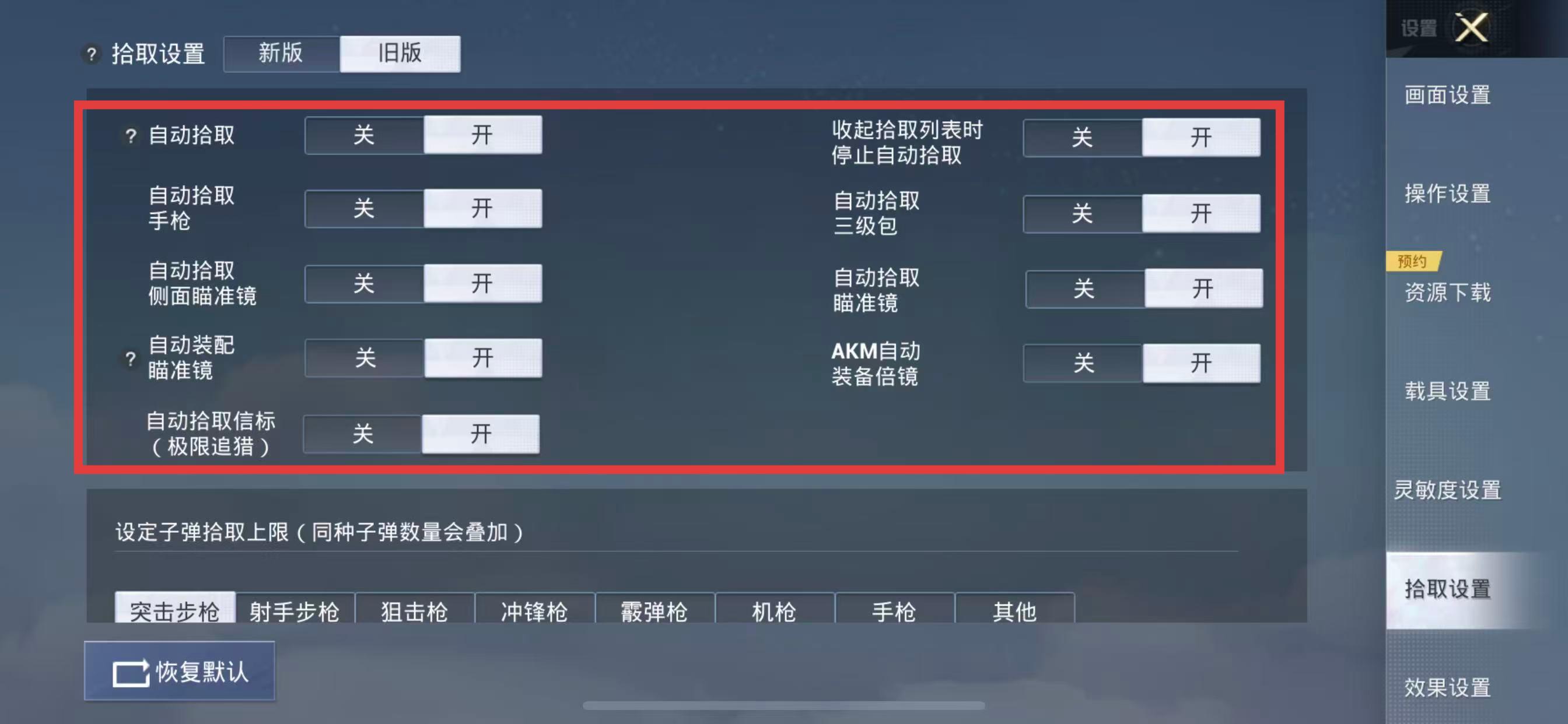3、找到并点击拾取设置选项,将需要自动拾取的物品对应的开关开启即可。