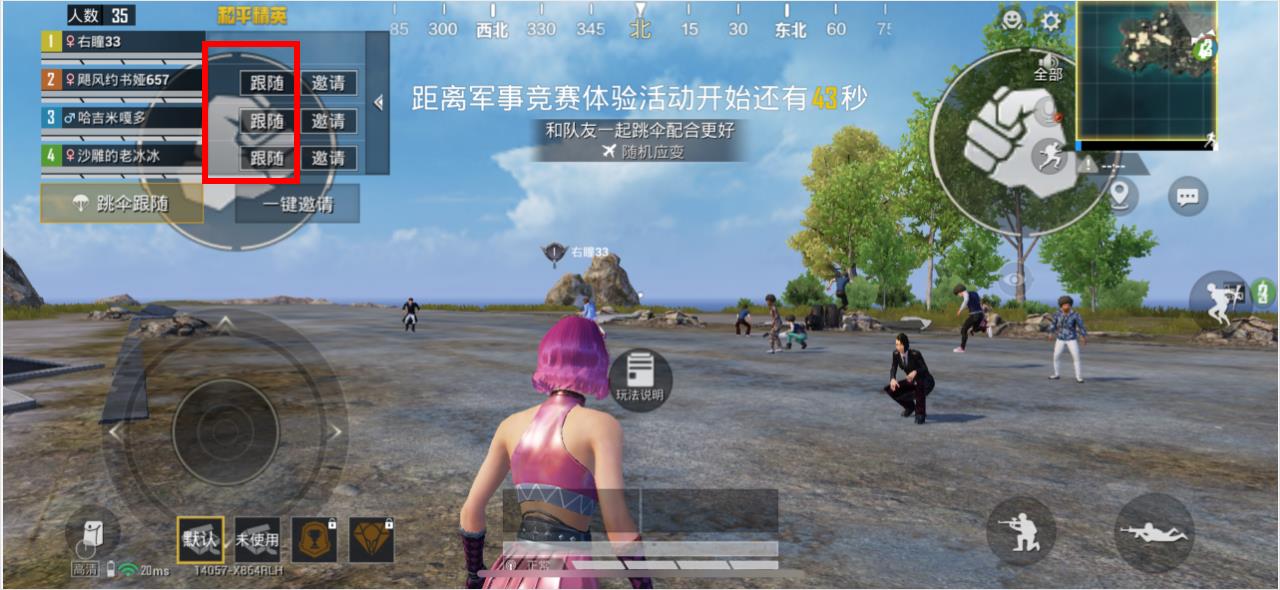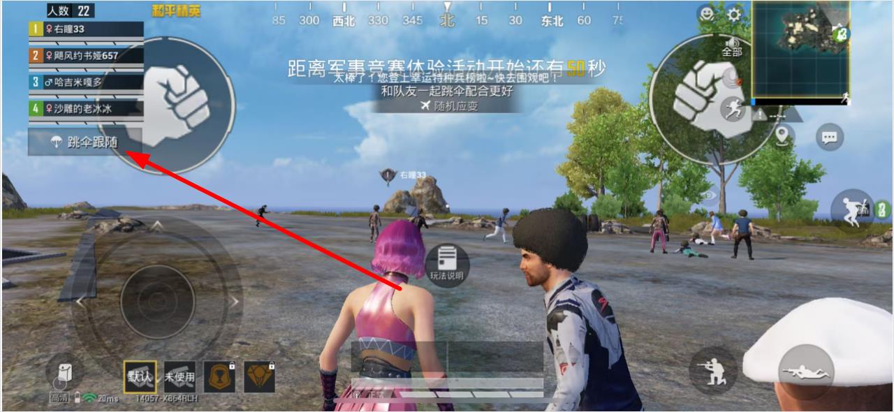 1、进入游戏组队等待界面后,点击屏幕左侧的跳伞跟随按钮。