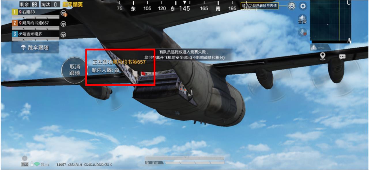 3、登上飞机后会显示正在跟随对应队友,等到队友跳伞时你会一同跳出飞机,实现跟随队友跳伞。