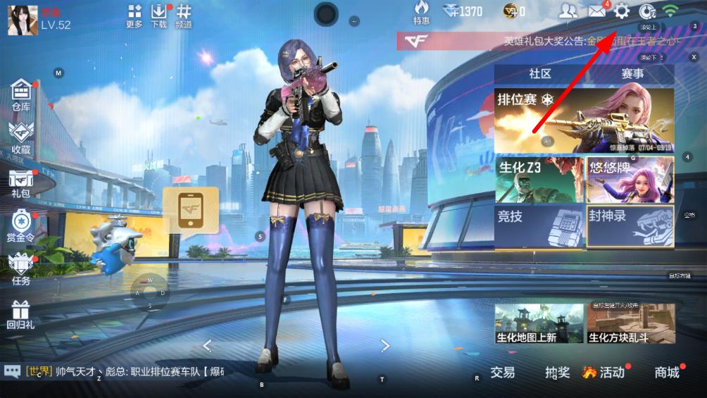 1、在穿越火线游戏的主界面,点击右上角齿轮状的设置图标,进入设置页面。