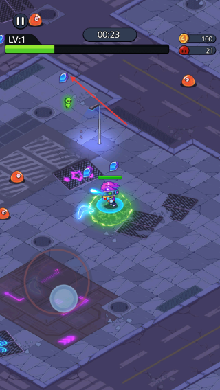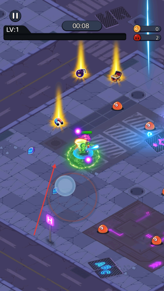 1、操控角色移动,留意屏幕上方信息,躲避敌人攻击并收集道具,提升角色生存能力。