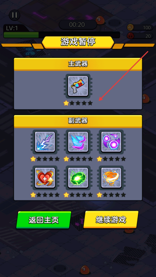 2、点击暂停按钮查看武器界面,依据主武器和副武器星级情况,选择升级高星级武器,增强战斗输出能力。