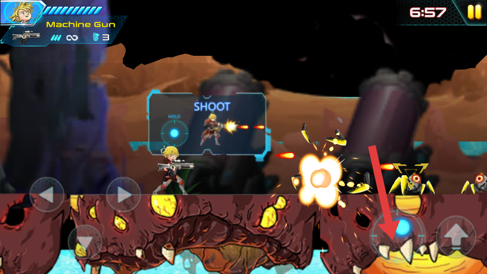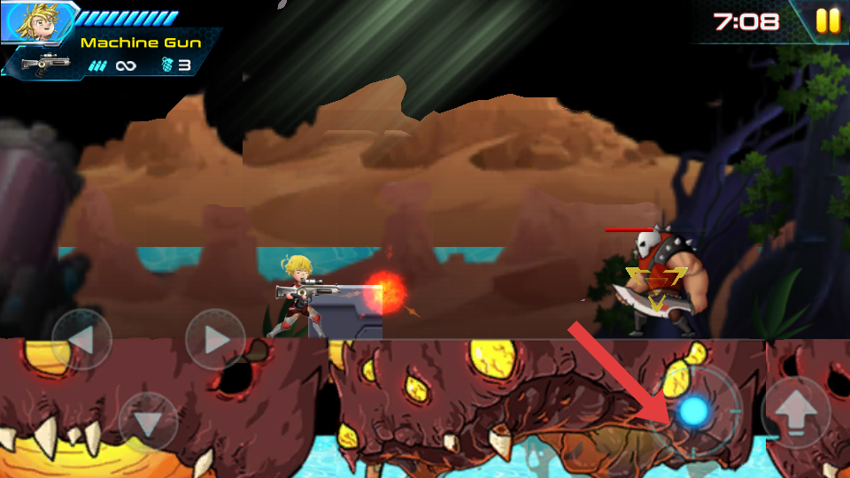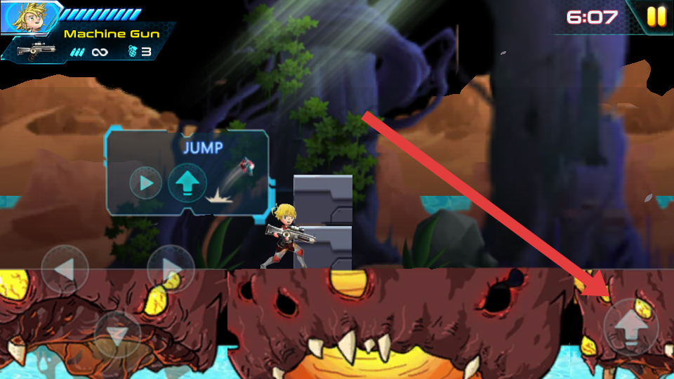1、先熟悉基础操作,通过方向键控制角色移动,空格键触发跳跃,鼠标点击或按键释放机枪射击,应对场景中地形障碍。