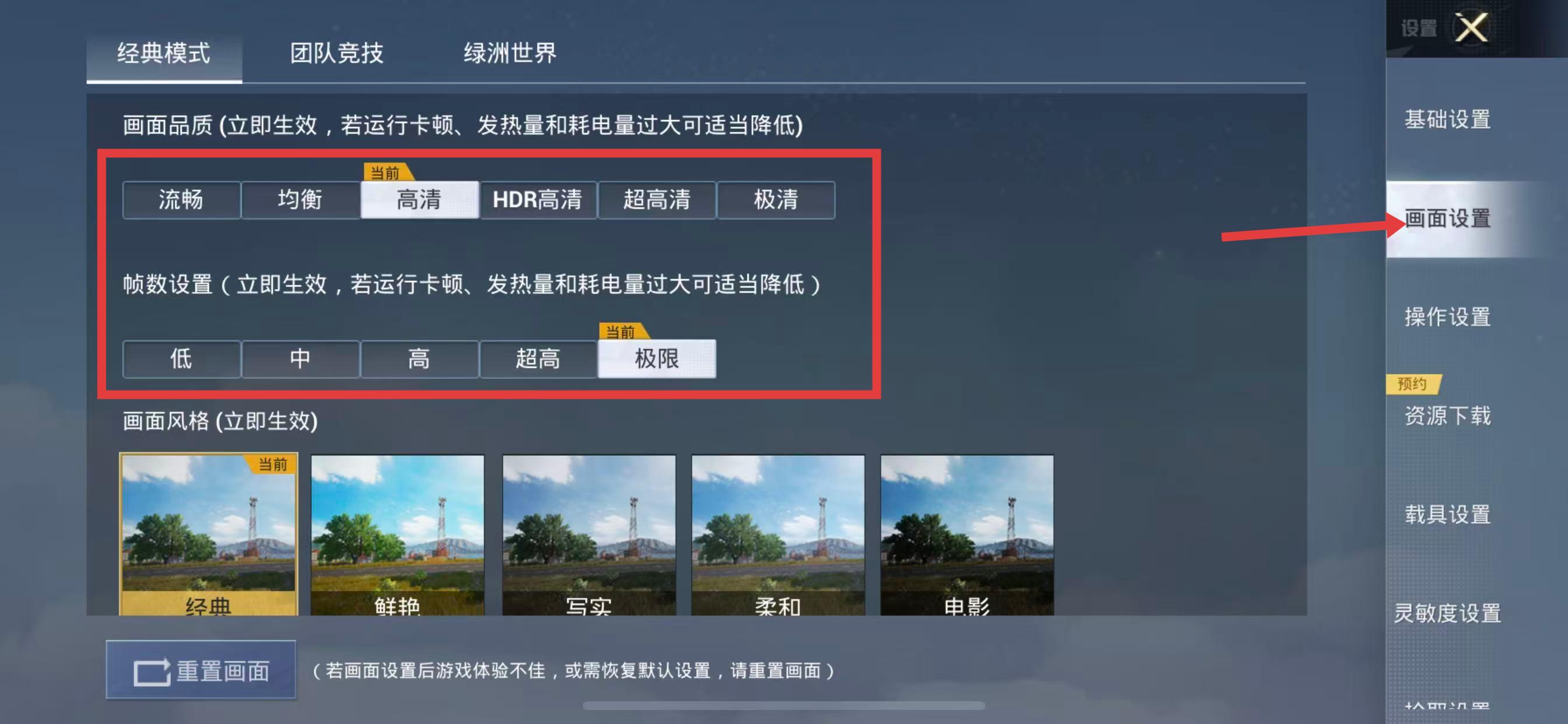 3、进入画面设置选项,即可对画面品质和帧数设置等进行调整。