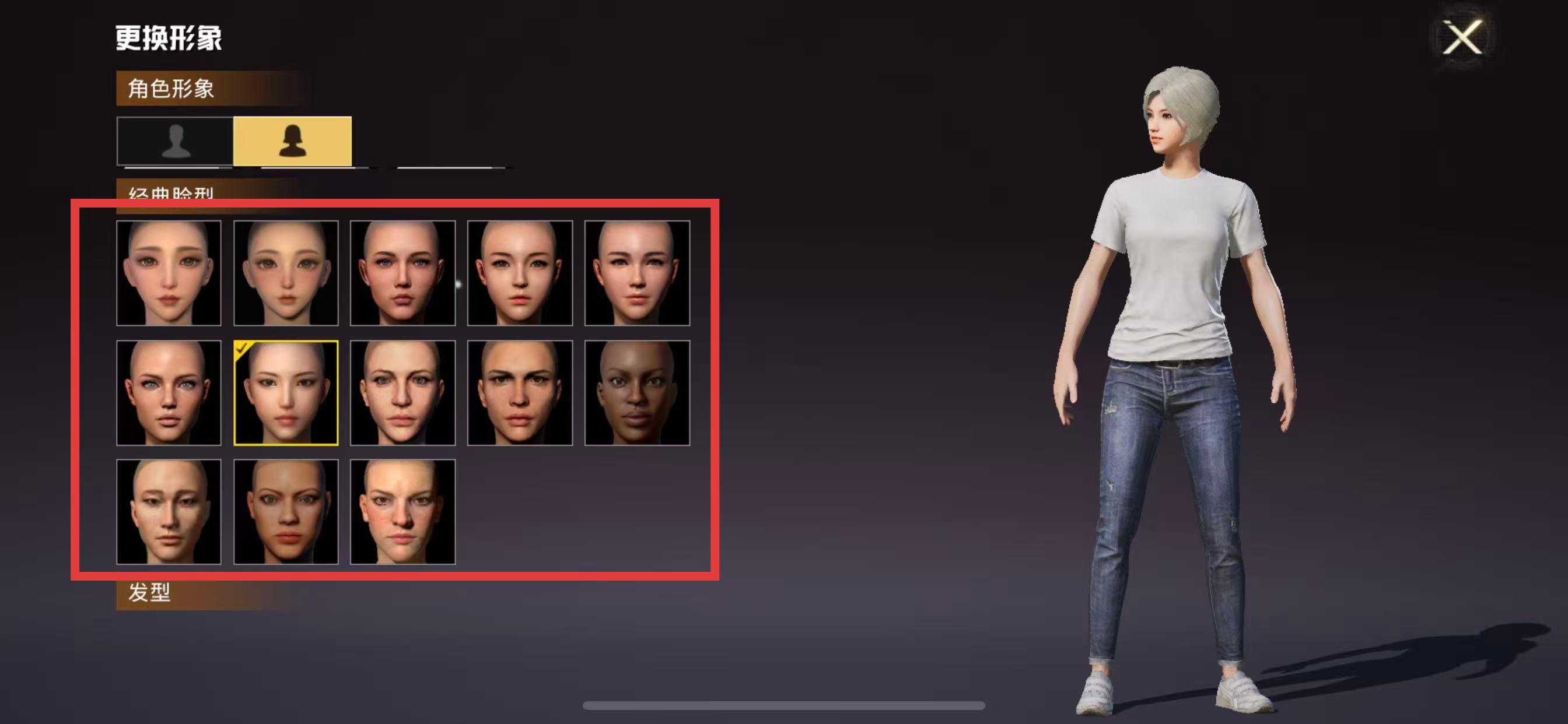 3、在角色形象的经典脸型区域,选择带有不同肤色的脸型,即可完成肤色颜色的更换。