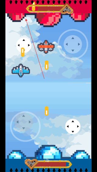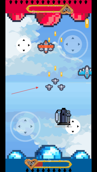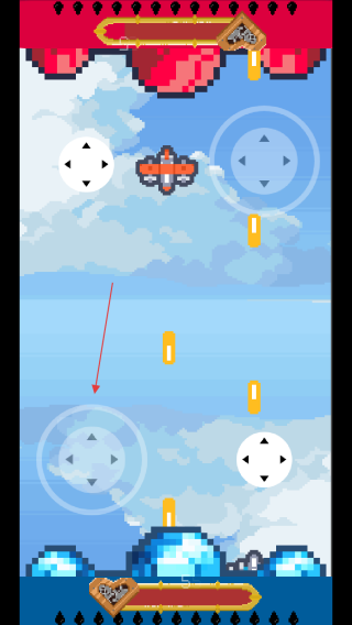 1、进入游戏,通过屏幕上的虚拟方向键操控己方飞机移动,躲避上方红色区域发射的子弹。