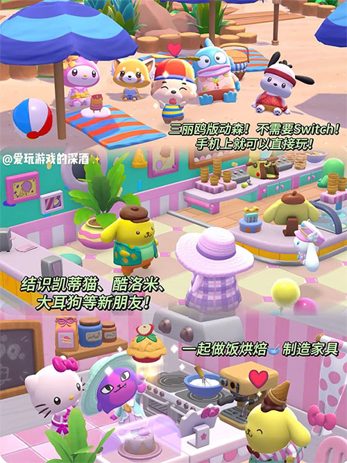 岛上有各种各样的生物、食物和需要解决的谜题,玩家可以制作美味的料理和实用的工具,装饰小屋,打造属于自己的乐园,玩家还可以与凯蒂猫、库洛米、大耳狗等三丽鸥角色成为好朋友并一同完成任务,预计登场18位三丽鸥角色。并且游戏还具有多人模式,可以与游戏好友一起玩耍。同与其它们一起制作稀有物品,解开古老谜题,并装饰小木屋來稀有新访客,打造出你的终极岛屿天堂。对于喜欢三丽鸥和动森类游戏的玩家来说,都是绝对值得一玩的游戏。谁能拒绝跟美乐蒂、库洛米、布丁狗、玉桂狗、帕恰狗、凯蒂猫一起当邻居呀!