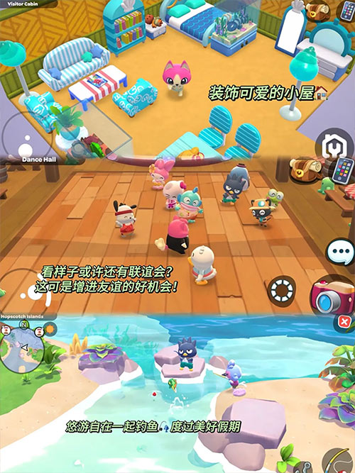 1、使用自定义形象在一座神秘岛屿上冒险和生活,与三丽鸥里的角色做邻居,打造家园并接待其他到来的游客。