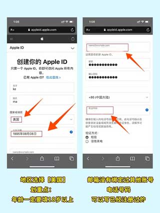 2、地区选择【美国】,并且年龄一定要填18岁以上。邮箱没有绑定过其他账号和电话号码的,可以写已经注册过的。