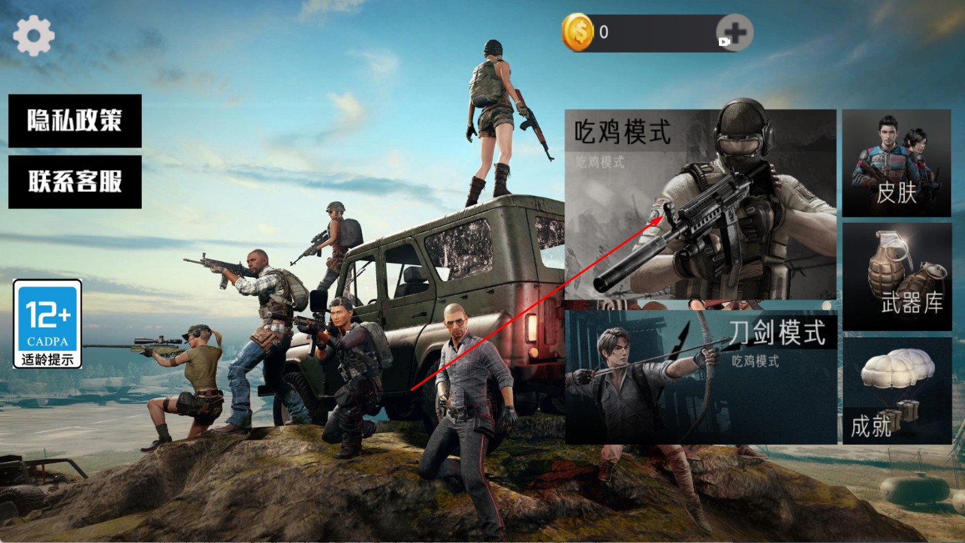 1、选择【吃鸡模式】,进入游戏场景,开启吃鸡对战。