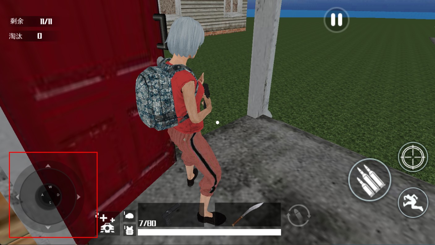 2、过程里,通过左侧摇杆操控角色移动,在房屋、草地等场景探索、转移。