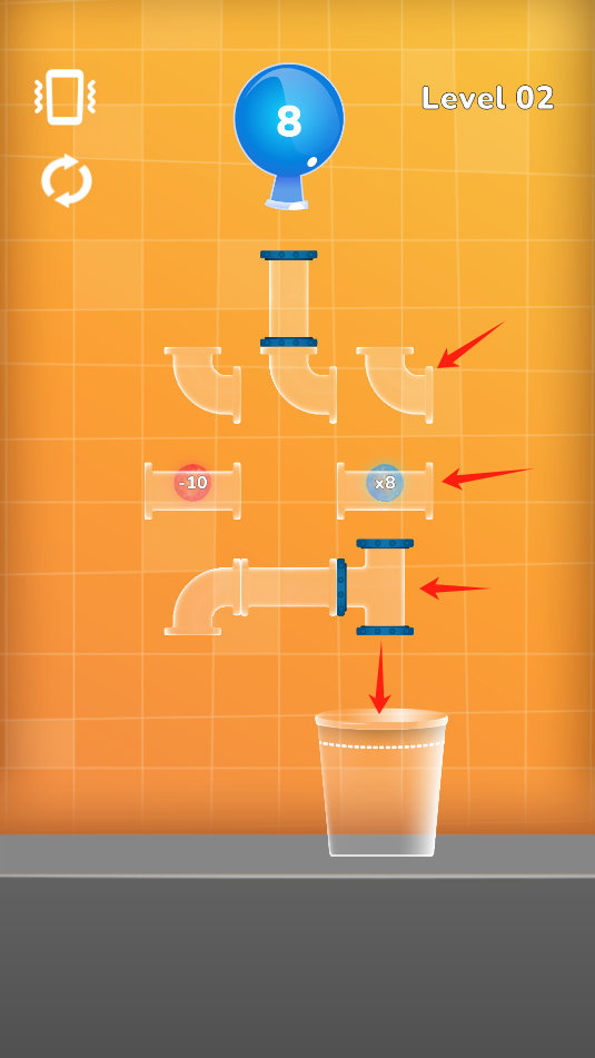 1、打开游戏,根据水流的方向点击水管,使水管的连接可以顺利流到桶里。