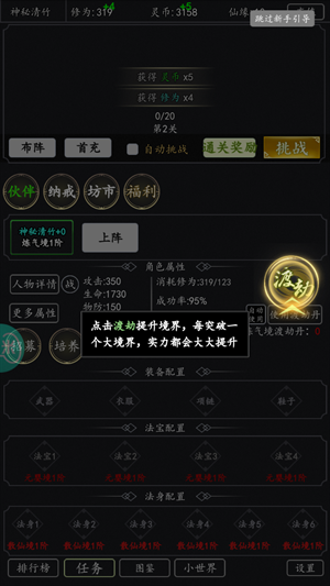 3、点击渡劫提升境界,每突破一个大境界,实力都会大大提升。