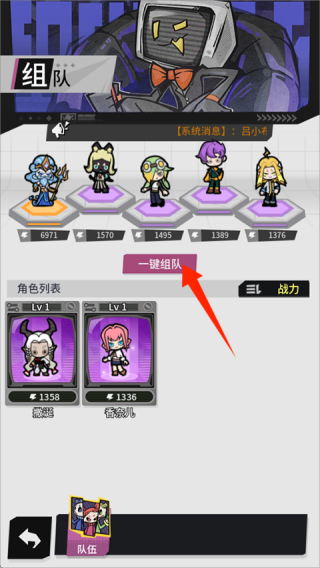 1、进入游戏,玩家需根据角色特长组建队伍,点击【一键组队】