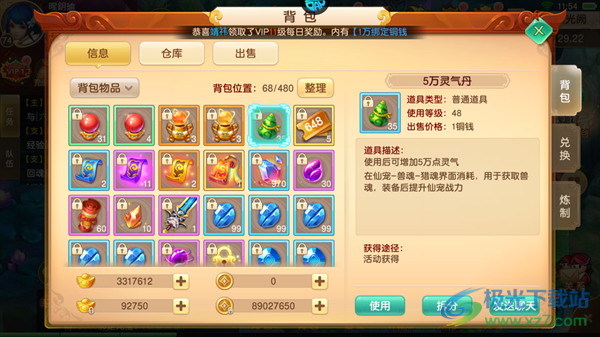 2、5万灵气丹:使用后可增加5万点灵气在仙宠-兽魂-猎魂界面消耗,用于获取兽魂,装备后提升仙宠战力。