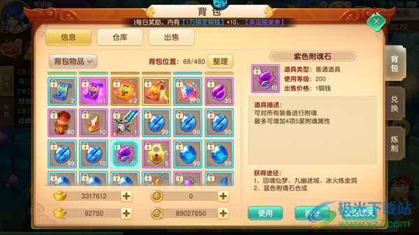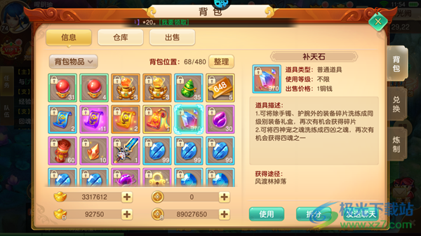3、补天石:可将除手镯、护腕外的装备碎片洗练成同级别装备礼盒,再次有机会获得碎片,还可以将四神宠之魂洗练成四凶之魂,再次有机会获得四魂之一。