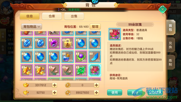 5、99朵玫瑰:赠送玫瑰后,对方的魅力值上升99点如果赠送给自己或仙侣,则增加温馨值999点如果赠送给普通好友,则双方亲密度增加99点。