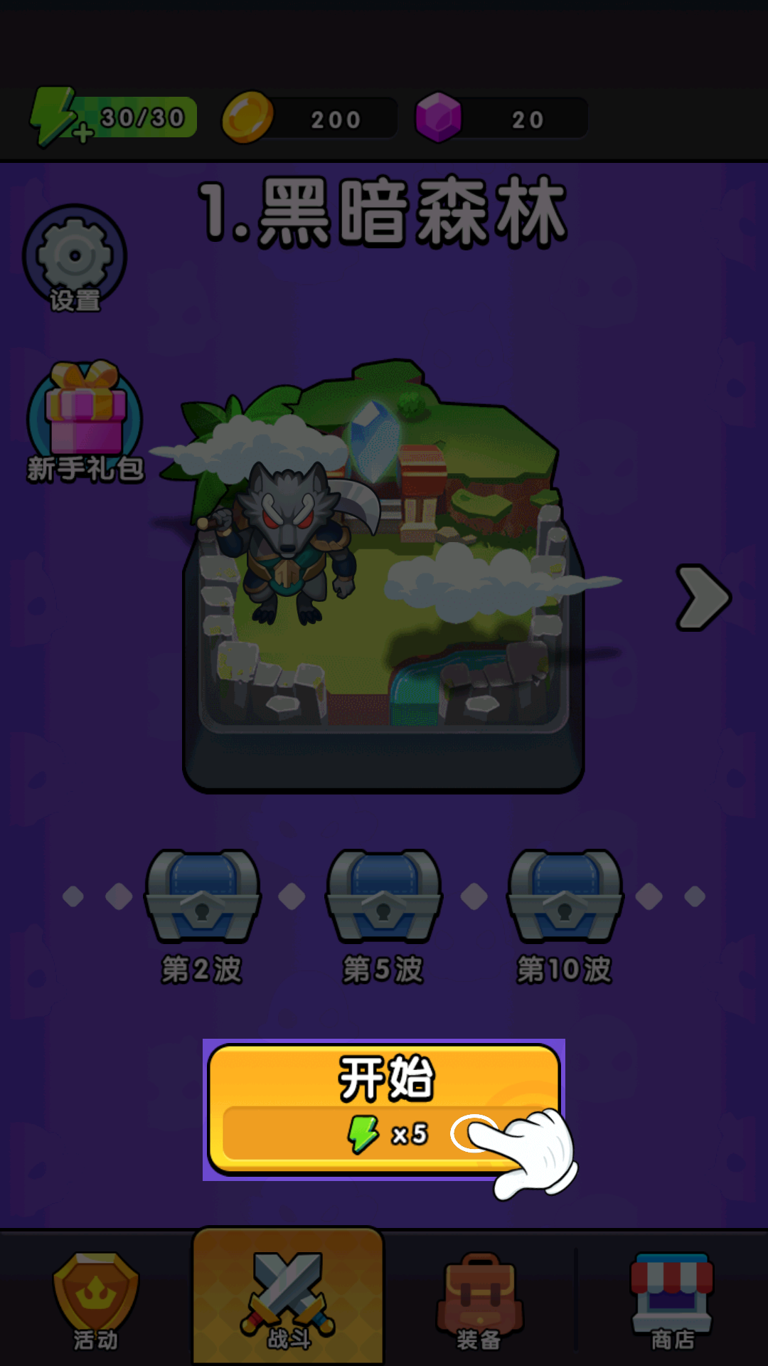 2、进入到主页面,我们一开始只能选这张地图,并且花费5点体力开始游戏。