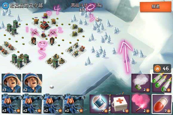 要注意圈4的点在火箭偏右一点点,以防被左侧的狙击打到,能量充足的话炸掉狙击就更好了。