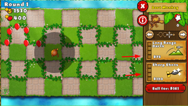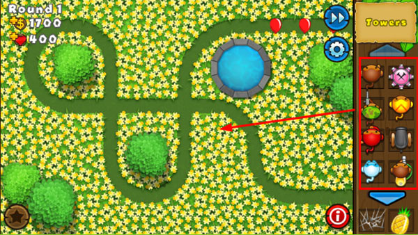3、选择伤害高的炮塔,放在合适的位置,防止气球到达终点;
