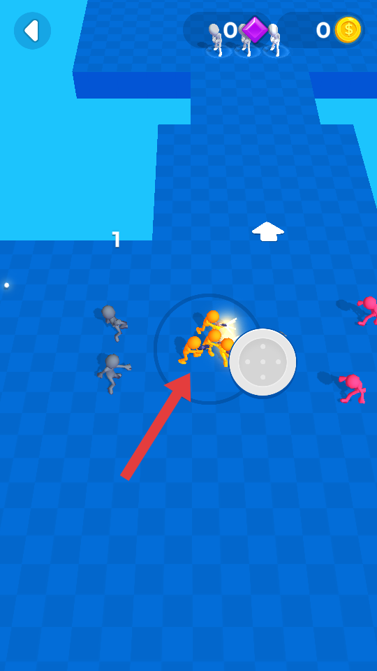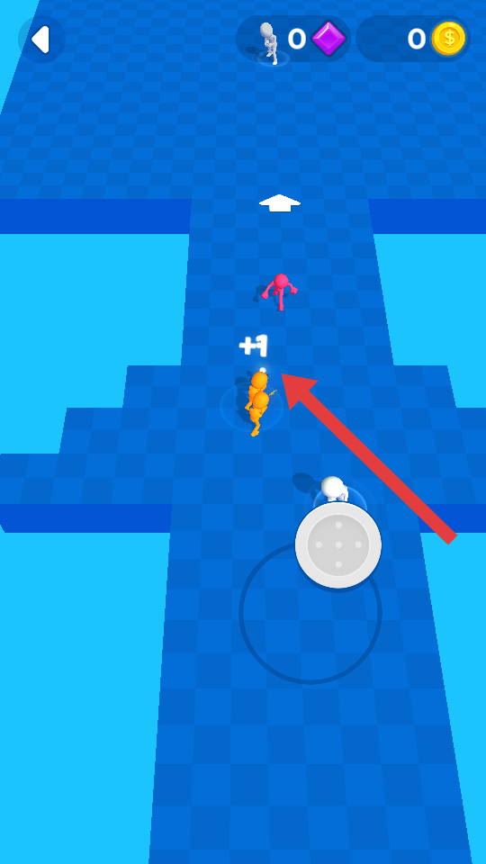 1、进入后,操控彩色小人在蓝色棋盘格场景移动,优先靠近散落的队友图标完成收集,初步扩大队伍规模。