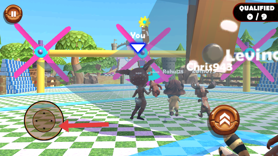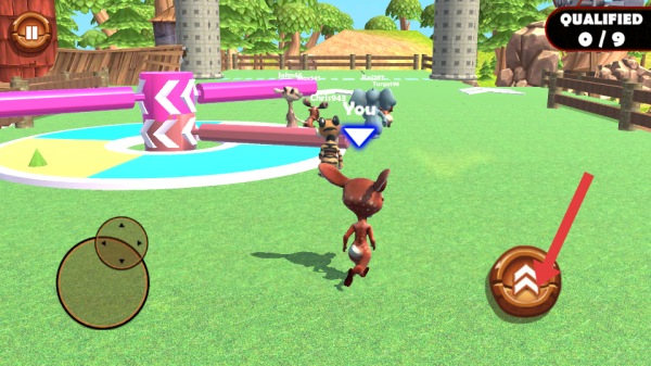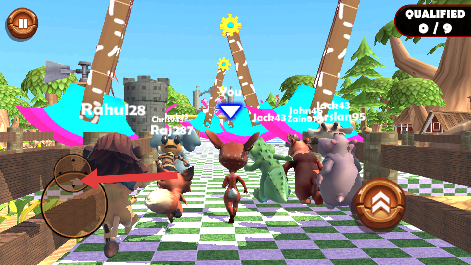 1、进入游玩后,明确关卡QUALIFIED0/9的晋级目标,操控卡通动物形象角色准备开启竞技闯关。