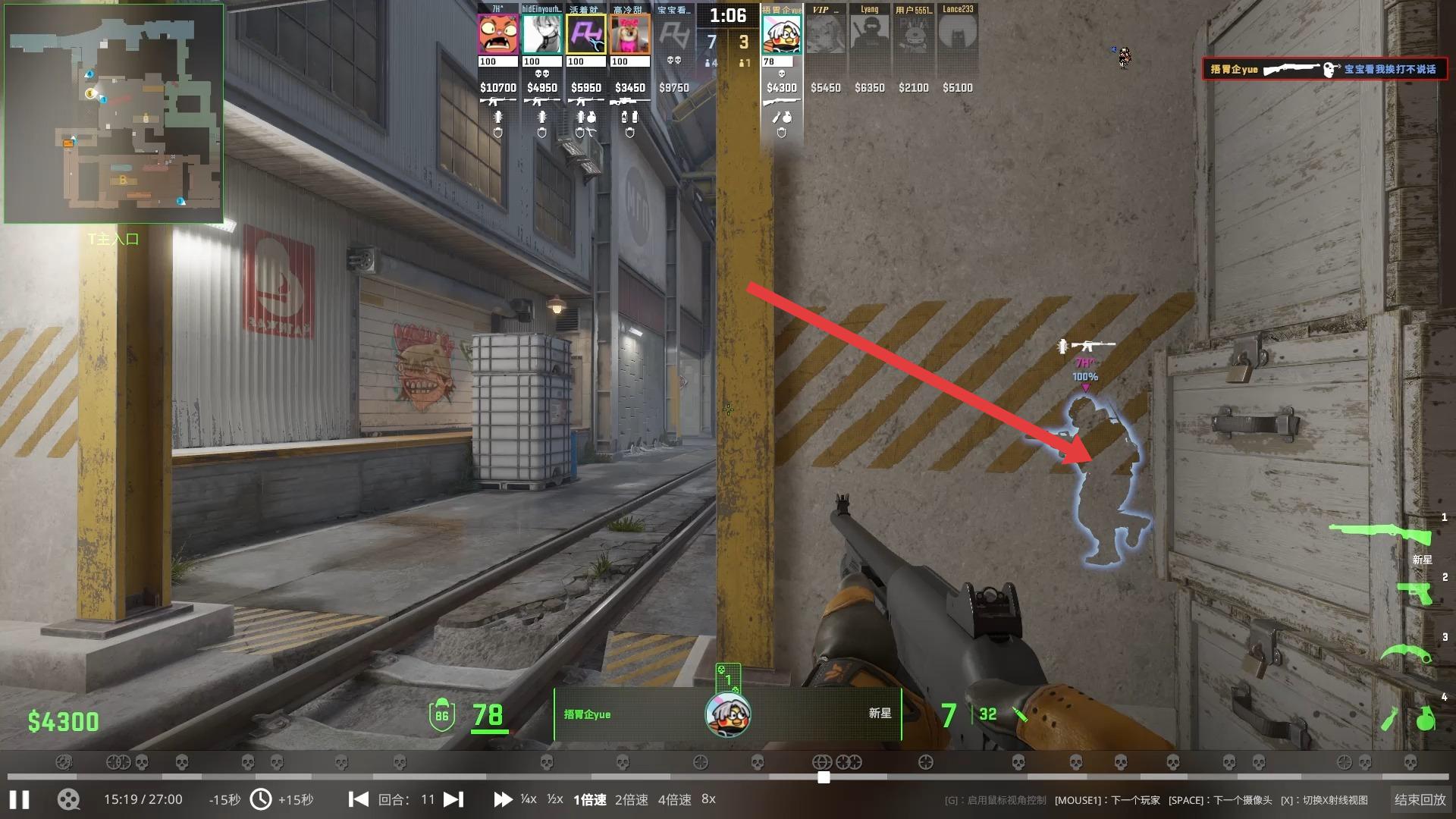 2、关注屏幕上方比分、队友信息、金钱数,按局势和金钱买合适武器装备,像当前$4300选性价比高的枪。