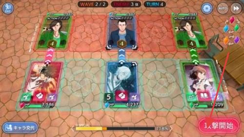 2、在战斗布局界面,观察敌我卡牌【HP】与技能,合理调整站位(如切换卡牌位置),利用属性克制,点击【攻撃開始】开启回合战斗。