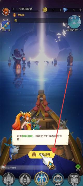 1、进入游戏主界面,跟随指引点击【開始挑戰】,开启冒险,先击败前方怪物,熟悉战斗流程,推进游戏进程。