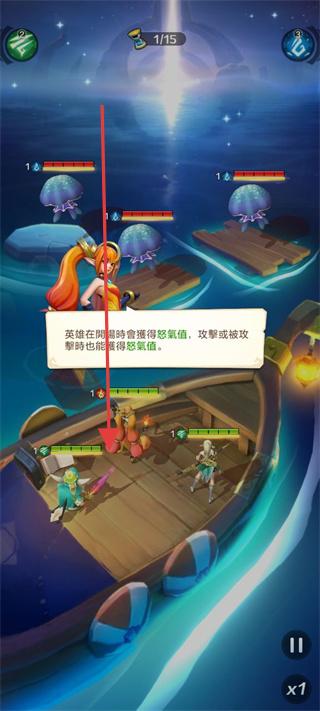 3、战斗时留意提示,英雄在湖域攻击或被攻击可攒怒气值,合理把控怒气释放时机,助力战斗,高效通关。