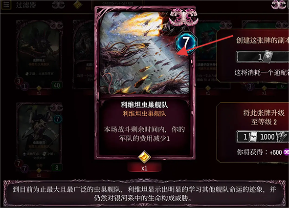 1、“利维坦虫巢舰队”卡牌(首图),费用7,能减军队费用,前期可规划费用,配合高费单位快速铺场,利用效果扩大场面优势。