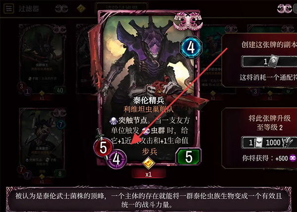 2、“泰伦精兵”卡牌(中图),费用4,依赖“虫群”触发增益,搭配能触发该效果的单位,如其他虫族卡牌,提升攻击与生存。