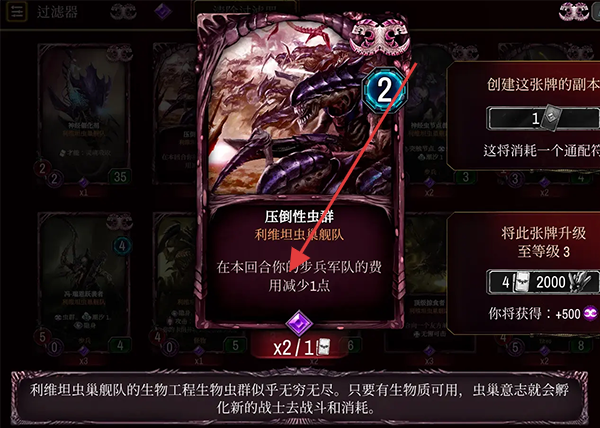3、“压倒性虫群”卡牌(末图),费用2,减步兵费用,可在步兵体系卡组中,前期快速下低费步兵,铺场抢节奏。