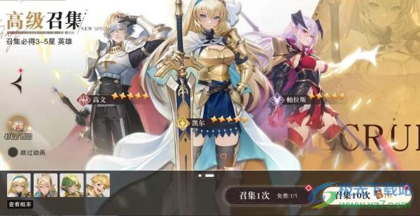 每天有一次免费召集英雄的机会,每次召集必得3-5星的英雄,30抽必得一个五星英雄,且召集使用的道具是高级召集令。