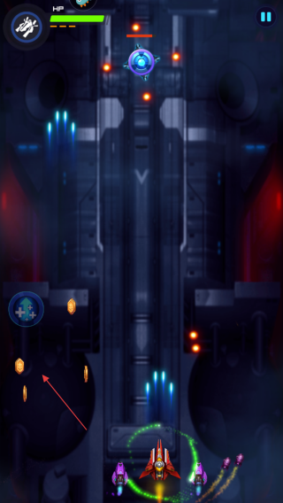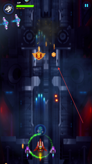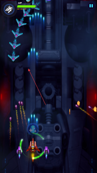 1、进入游戏,通过滑动屏幕操控己方红色主战机移动,注意屏幕左上角HP的生命值条,确保战机安全。