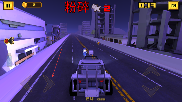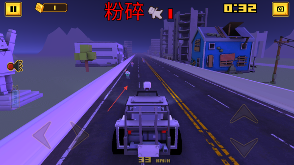 2、看到路上的僵尸后,驾驶车辆撞击僵尸,成功撞击会显示粉碎及撞击数量,同时获得金币。