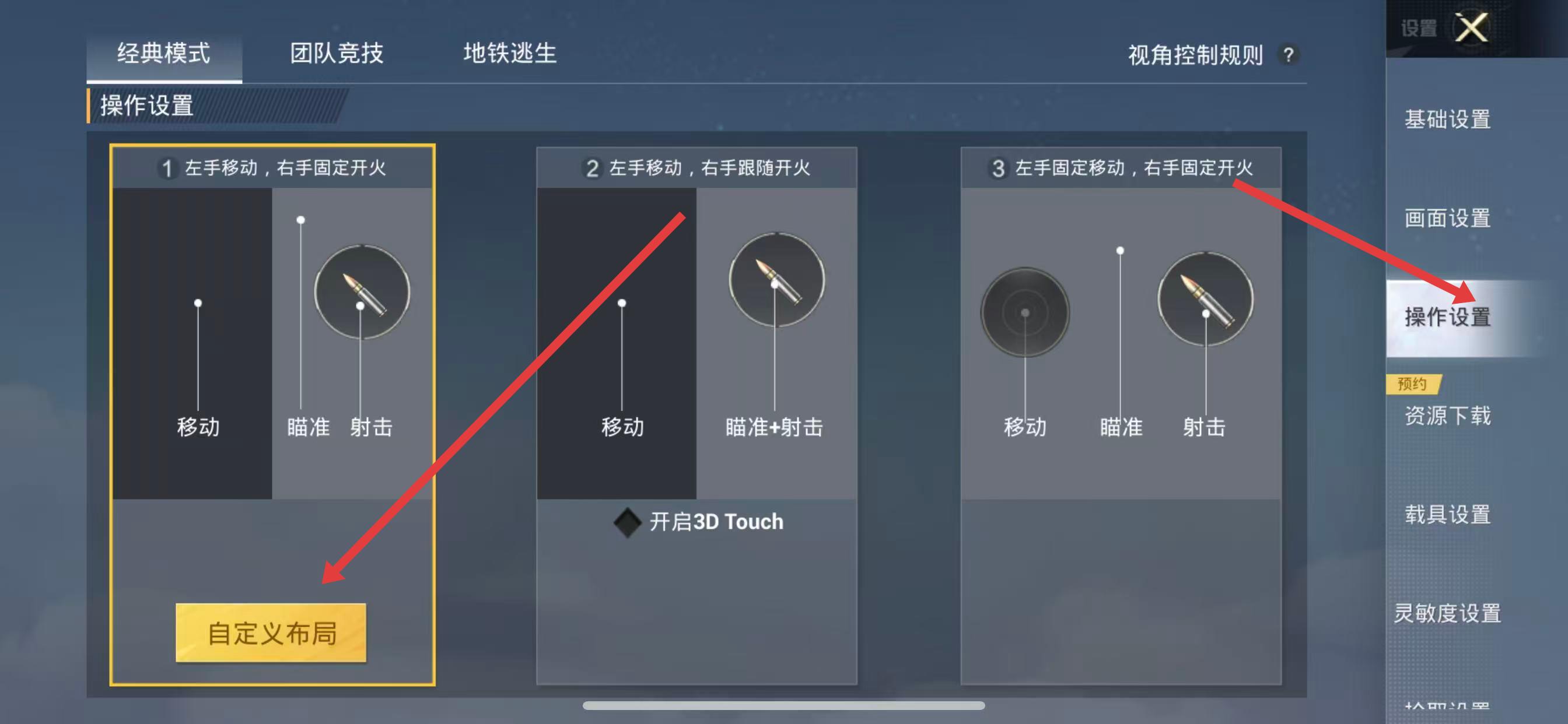 3、在操作设置页面中,选择一种基础操作布局,然后点击下方的自定义布局按钮。