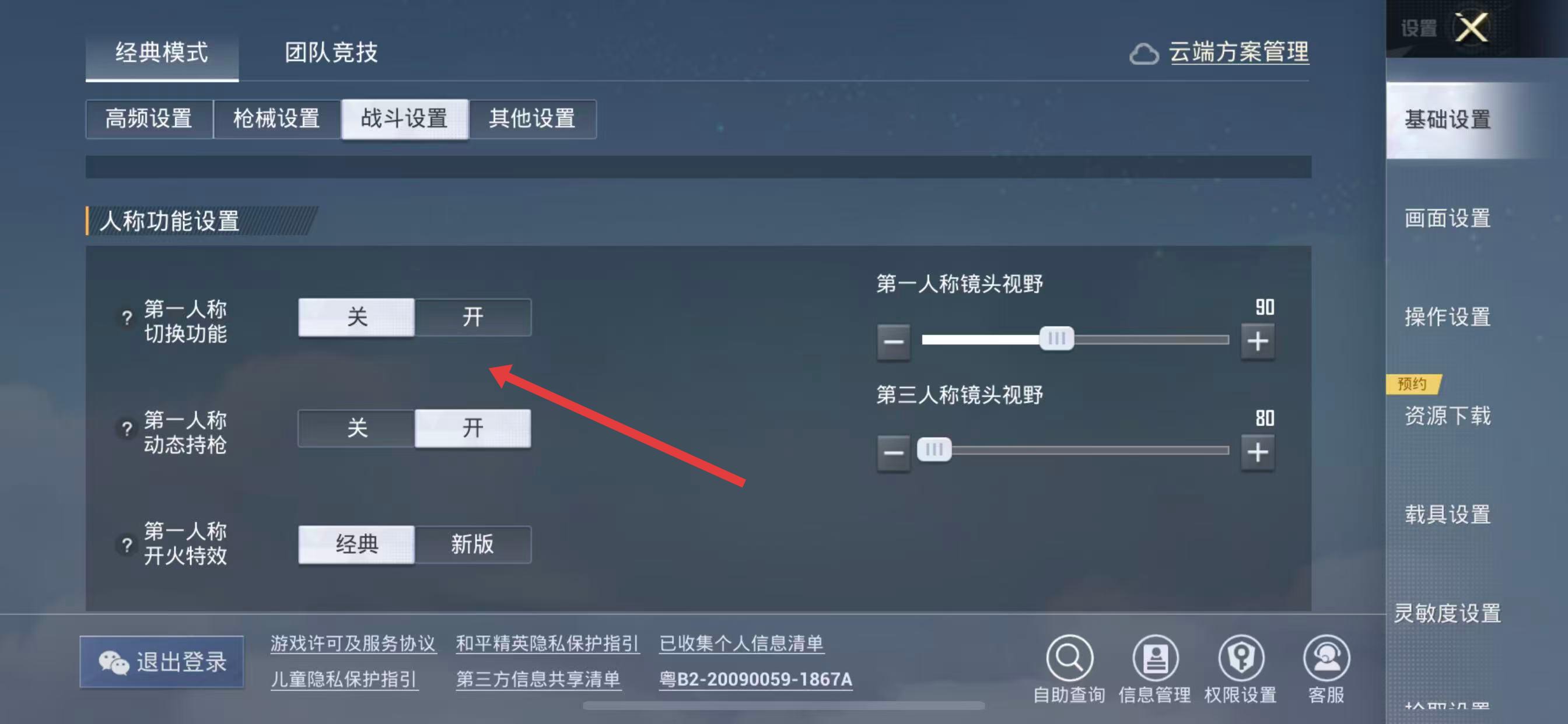 4、找到第一人称切换功能,点击其对应的开按钮,即可开启第一人称切换功能。