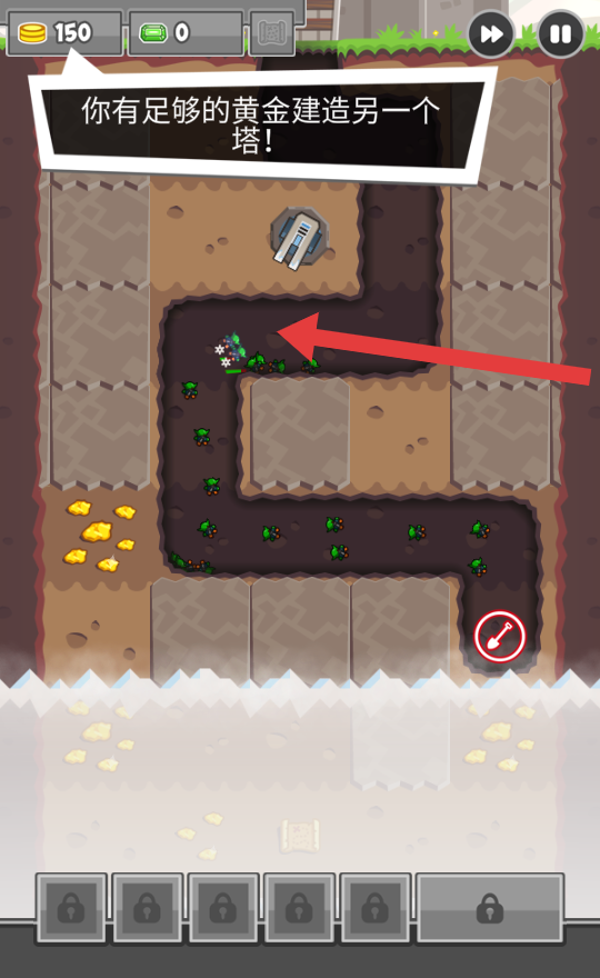 2、依照地下路径走向补建防御塔,利用冰塔减速等特性拦截敌人,要注意收集路径上的金币,确保资源的充足。