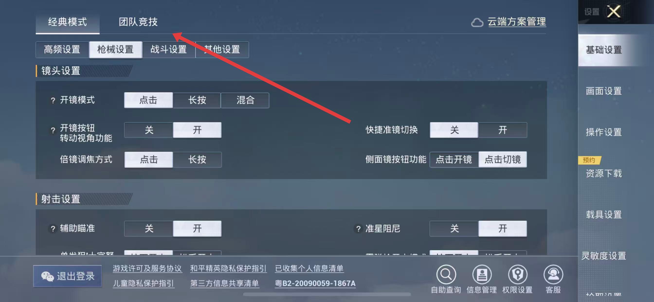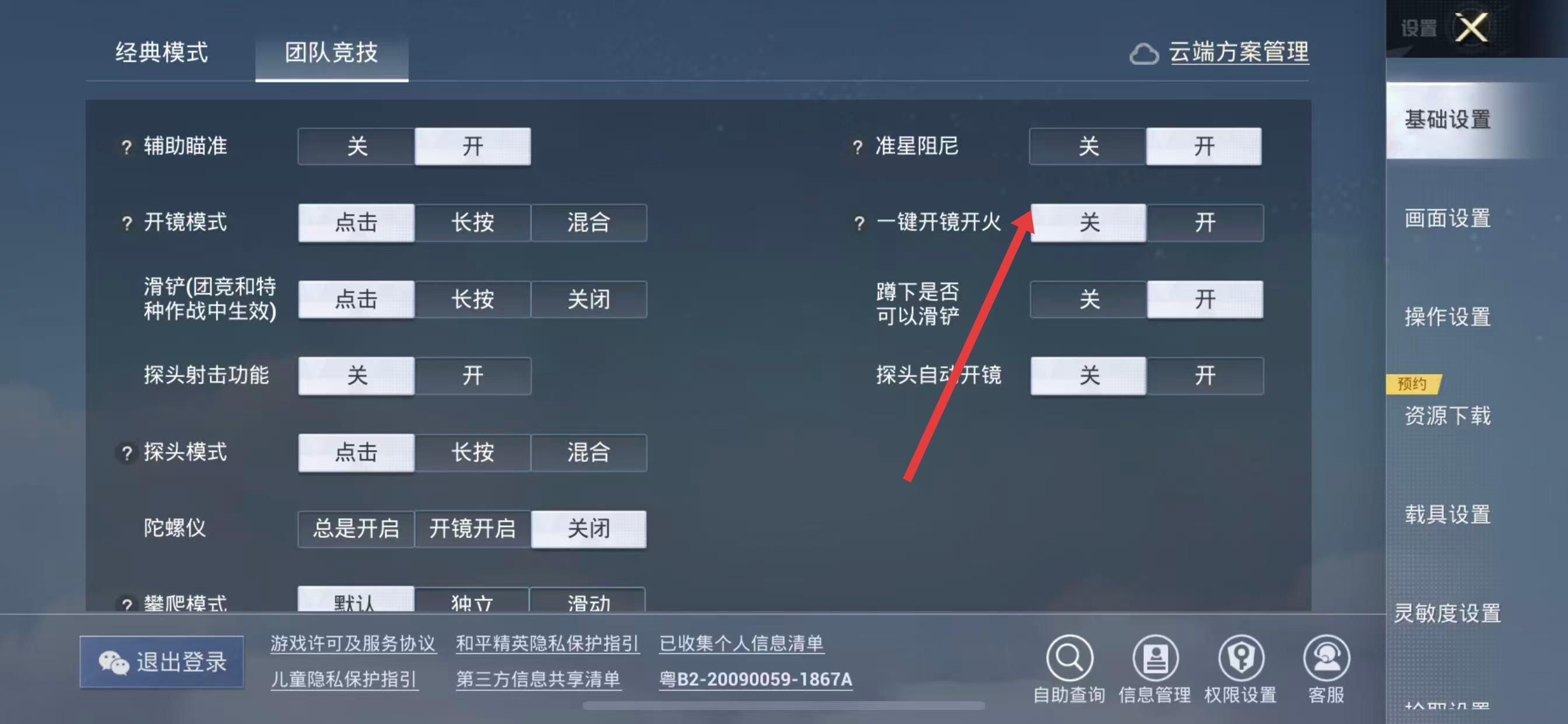 4、找到一键开镜开火选项,点击其对应的开按钮,即可开启一键开镜开火功能。