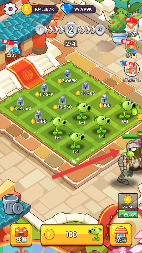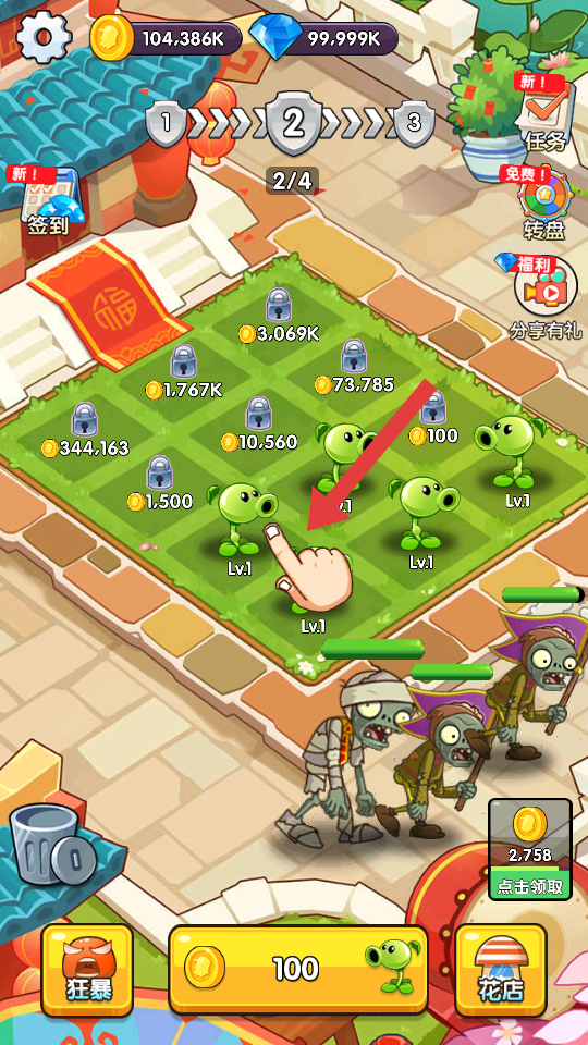 1、进入关卡后,按照指引点击草坪空位,花费100金币种植Lv.1豌豆射手,依靠其发射豌豆攻击,阻挡僵尸靠近。