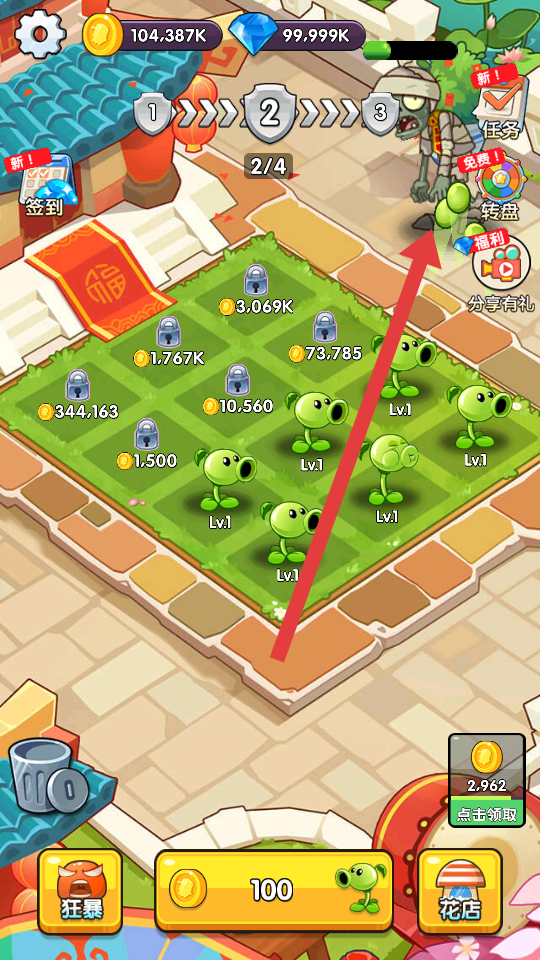 3、推进关卡时,留意右上角的任务与福利入口,完成任务可获取奖励;遇到大量僵尸时,提升植物攻击的效率。