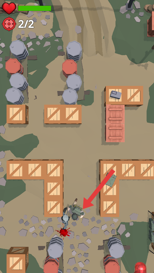 1、进入游戏场景,利用木箱、油桶等作为掩护,规避敌人攻击,同时留意屏幕上方剩余目标数与生命值,保障生存推进。