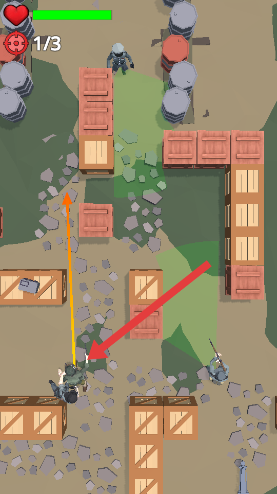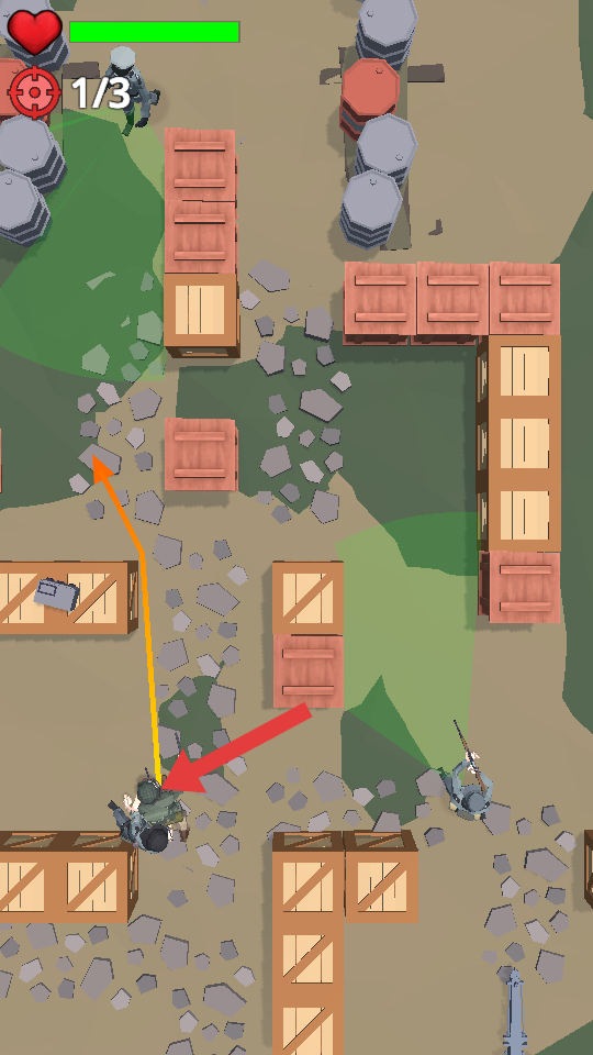 2、沿黄色箭头指示路径移动,途中借助场景掩体躲敌人,按箭头方向行进,逐步靠近并完成目标,注意避开敌人视野。