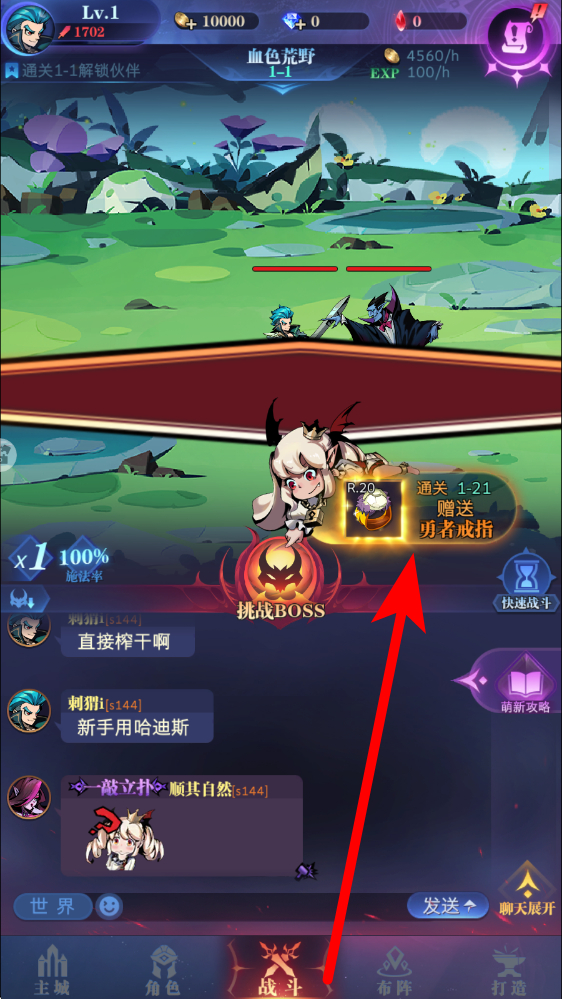 2、新手进入战斗场景后,推进关卡血色荒野1,达成通关条件通关21关可获取奖励勇者戒指,提升角色战力,持续拓展冒险进度。