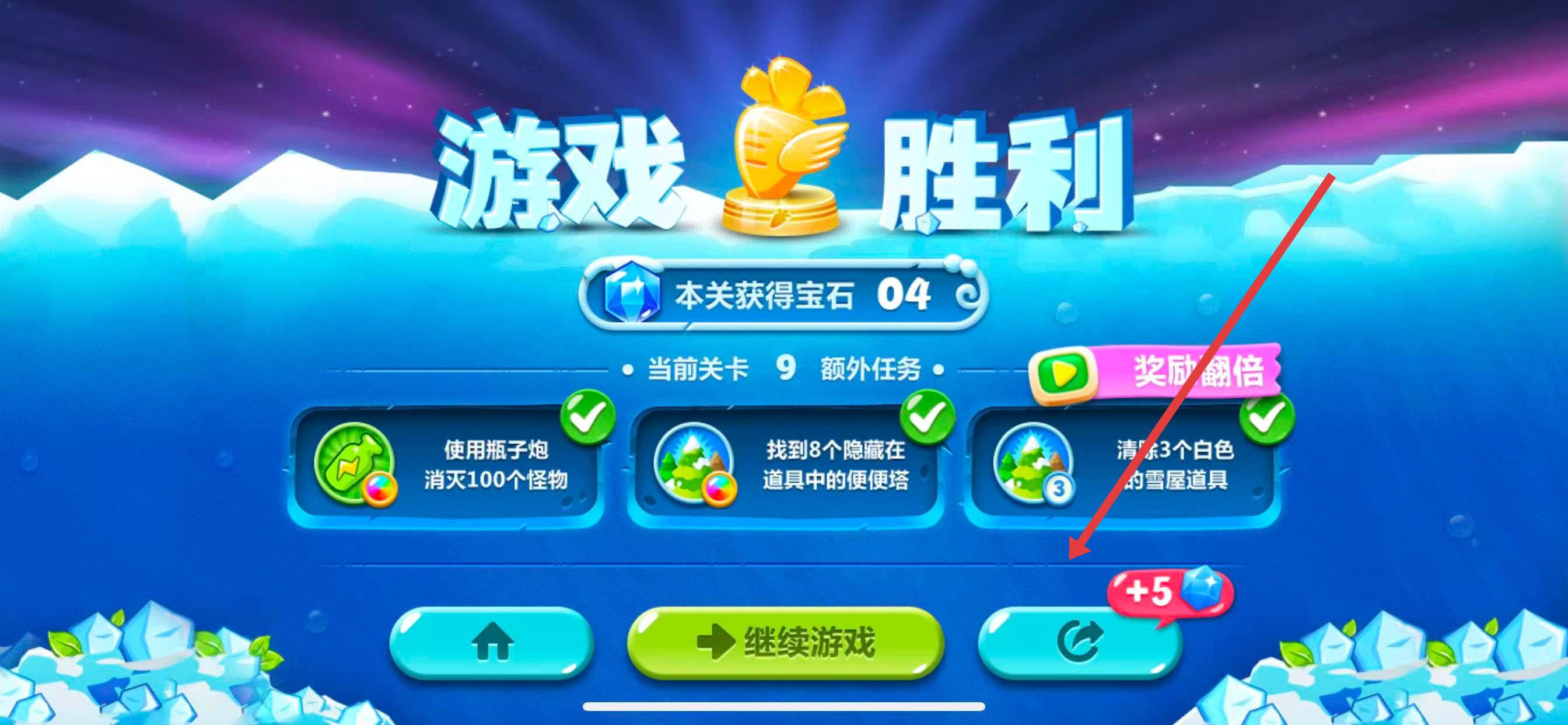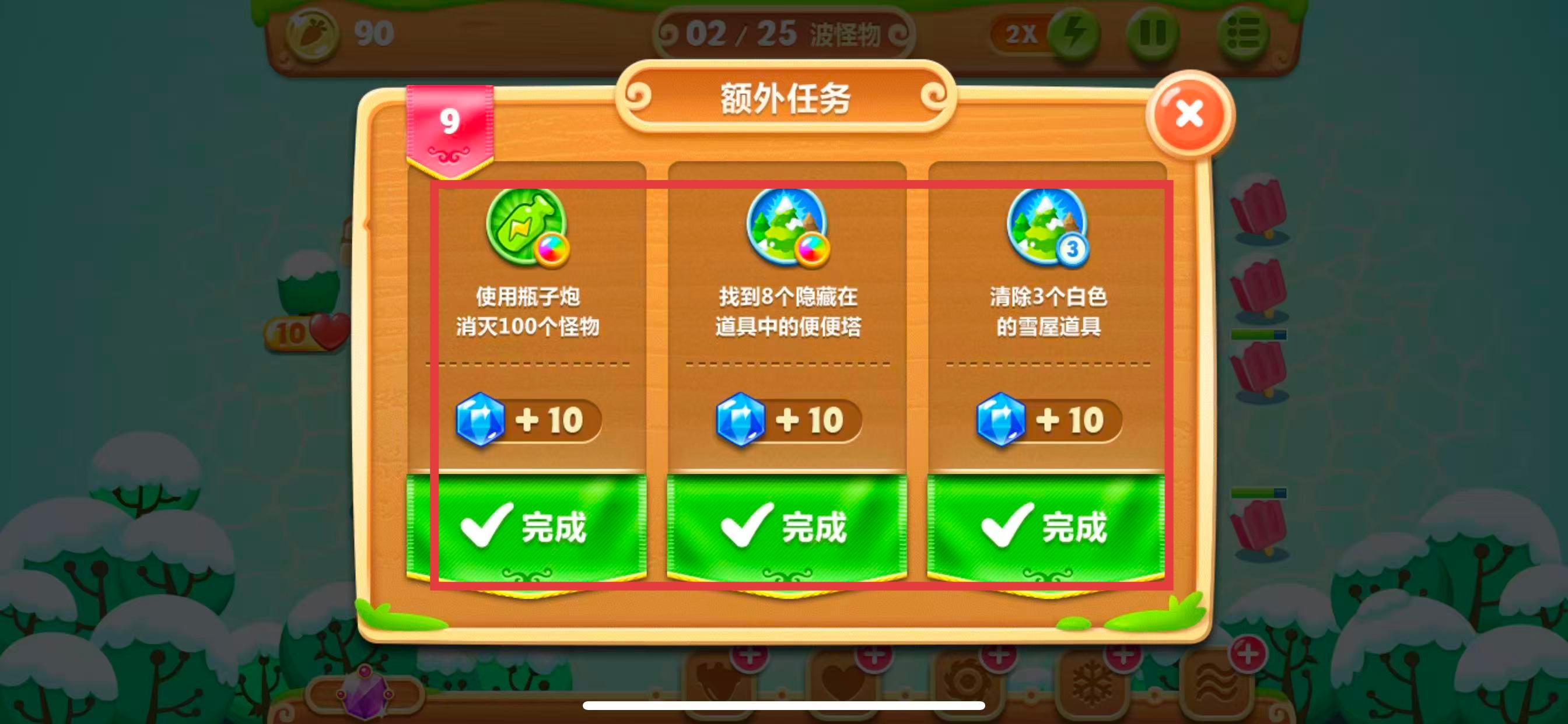 1、查看每一关的额外任务要求,像第9关使用瓶子炮消灭100个怪物、找到8个隐藏在道具中的便便塔、清除3个白色的雪屋道具,一个任务完成即可获得十个晶体。