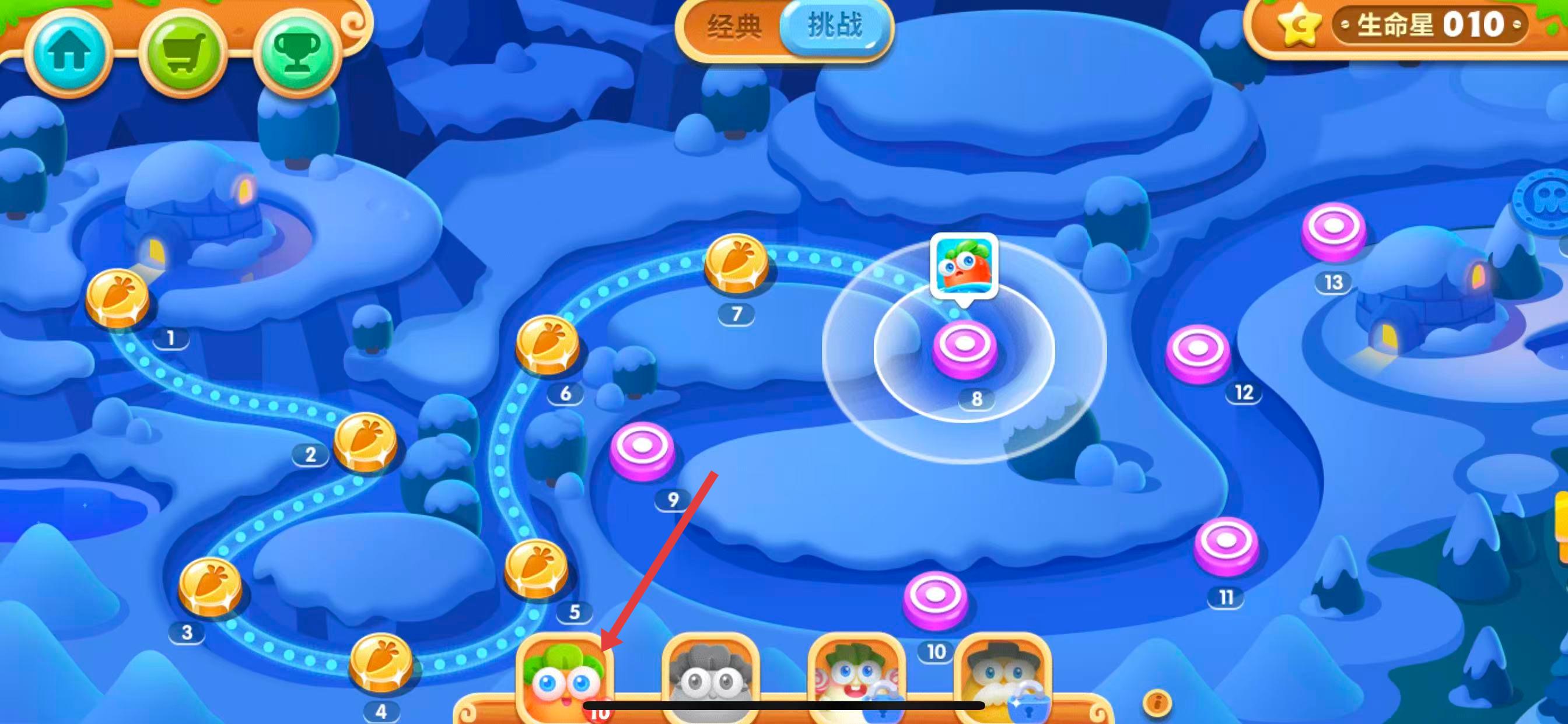 3、在挑战模式界面下方,找到显示当前萝卜的图标区域,点击该区域打开萝卜选择面板。