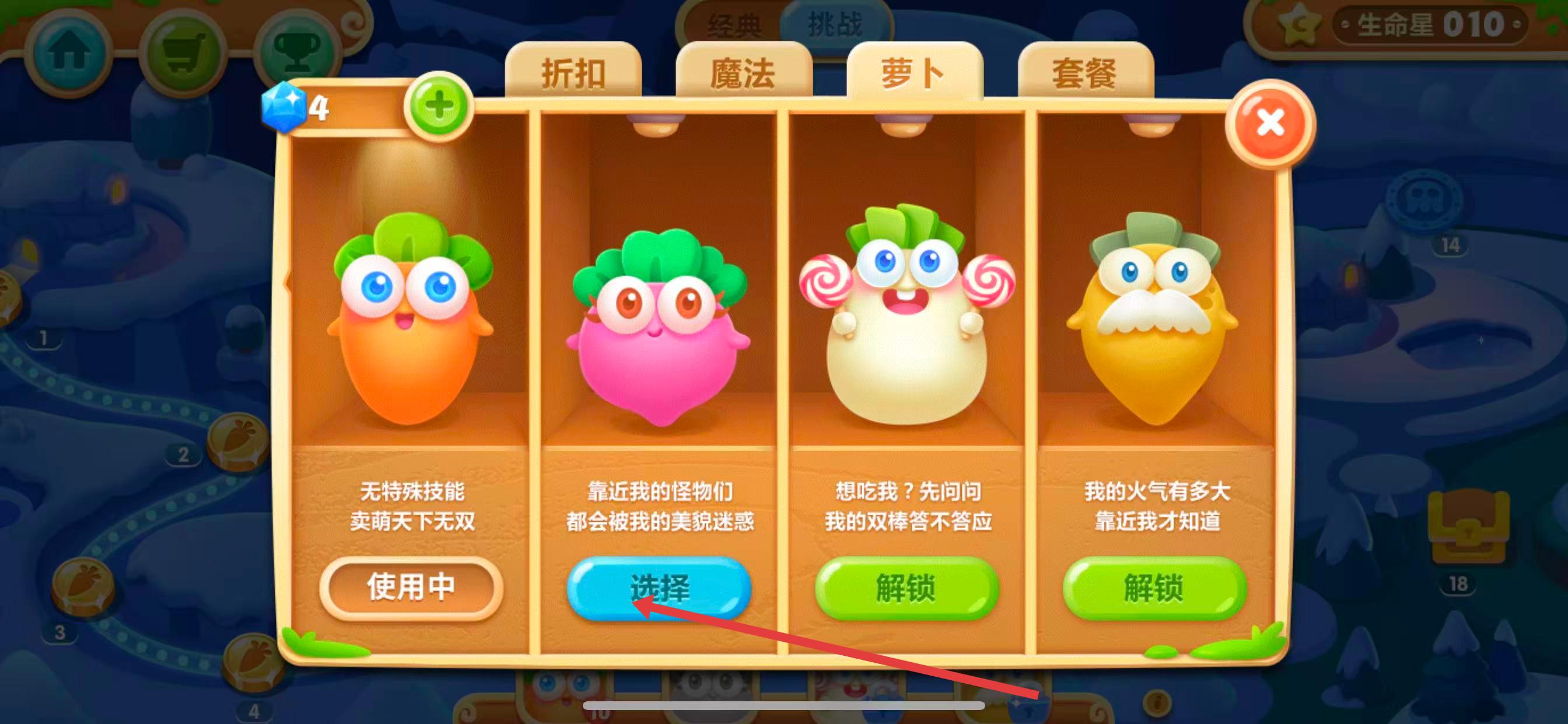 4、在萝卜选择面板中,点击粉色萝卜下方的「选择」按钮,即更换为粉色萝卜。