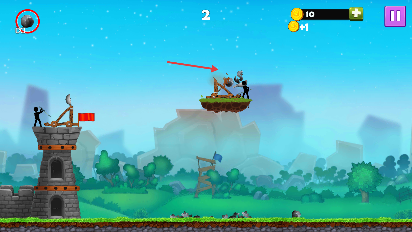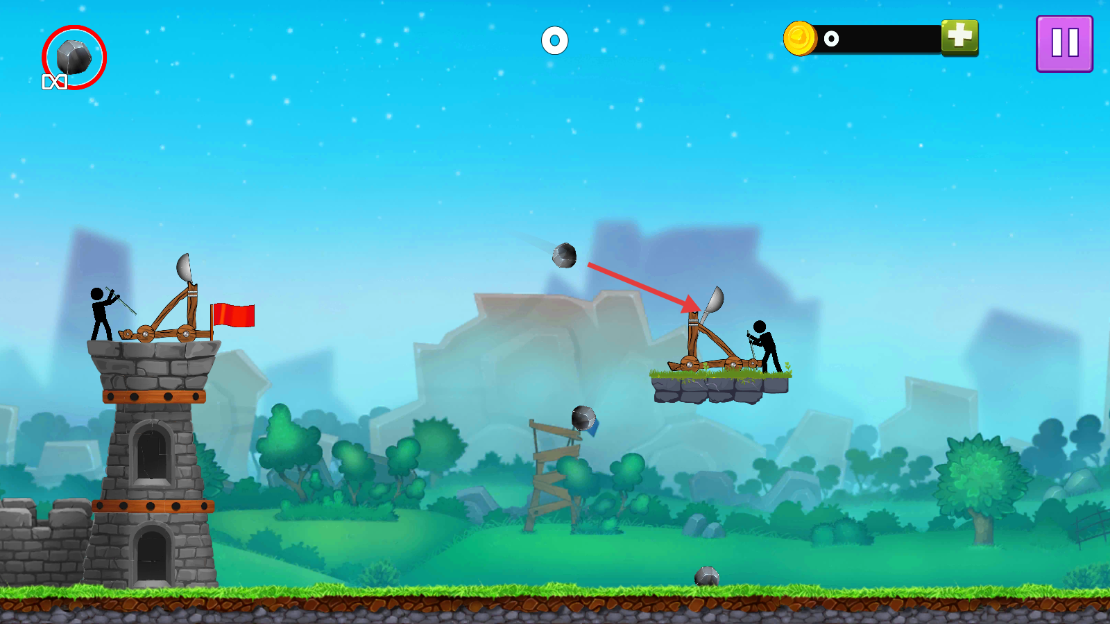 2、发射【黑色石块】,精准命中敌方【投石机】,破坏其攻击器械,削弱威胁。